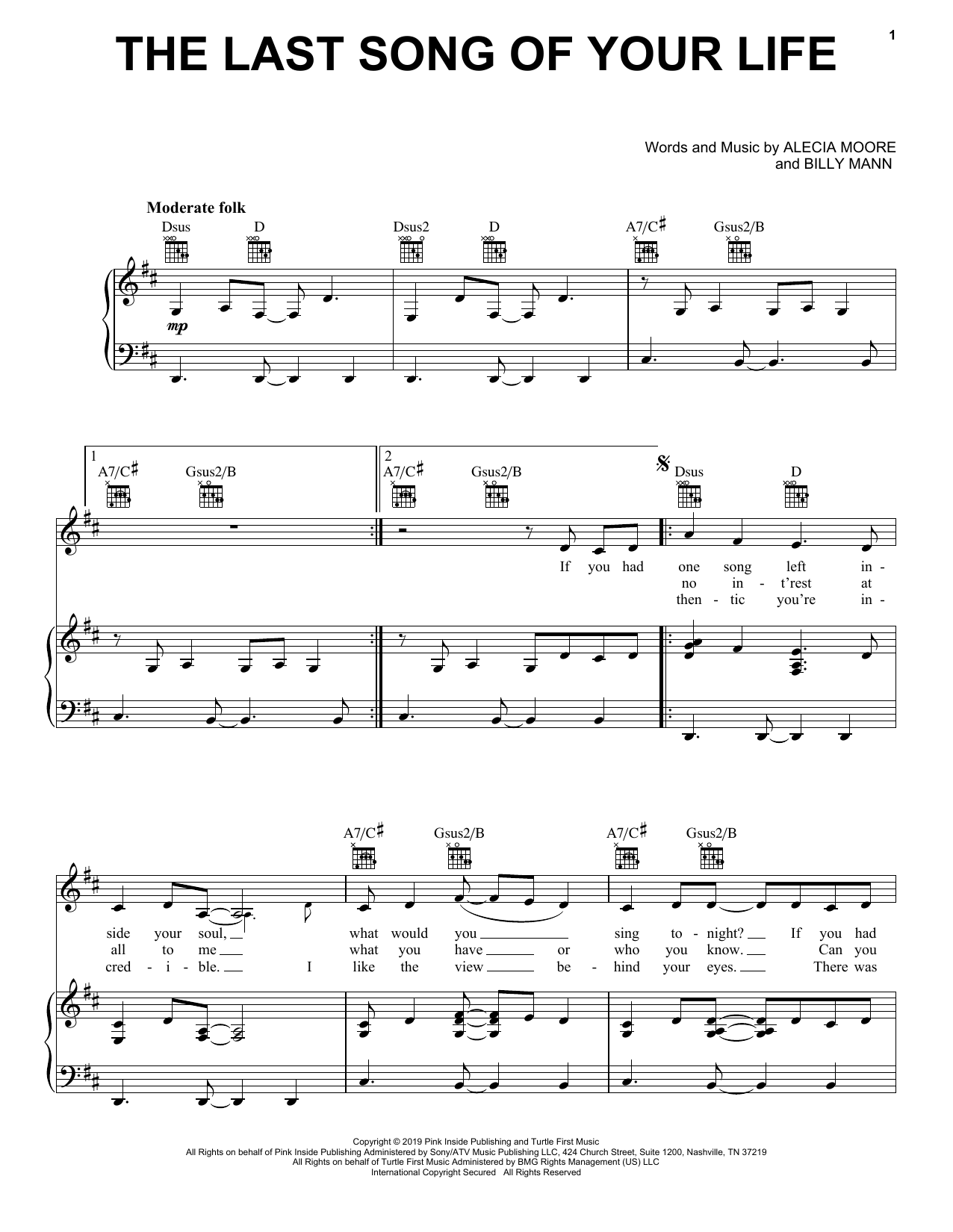 Download or print Pink The Last Song Of Your Life sheet music, chords and digital score arranged for Piano, Vocal & Guitar Chords (Right-Hand Melody). This Pop score includes 5 page(s).