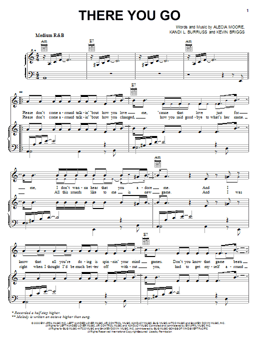 Download or print P!nk There You Go sheet music, chords and digital score arranged for Piano, Vocal & Guitar Chords (Right-Hand Melody). This Pop score includes 6 page(s).