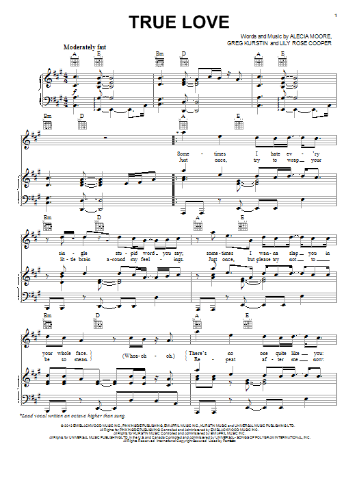 Download or print Pink True Love sheet music, chords and digital score arranged for Piano, Vocal & Guitar Chords (Right-Hand Melody). This Pop score includes 6 page(s).