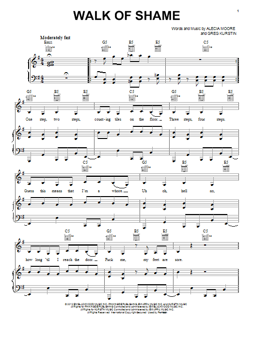 Download or print Pink Walk Of Shame sheet music, chords and digital score arranged for Piano, Vocal & Guitar Chords (Right-Hand Melody). This Pop score includes 5 page(s).