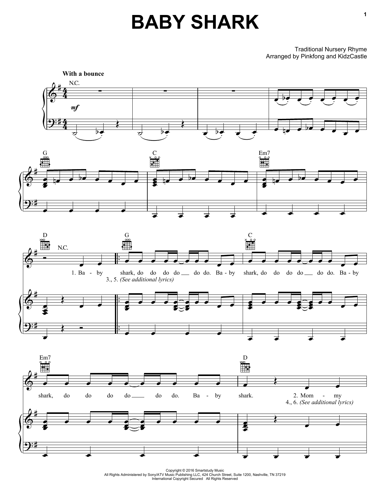 Download or print Pinkfong Baby Shark sheet music, chords and digital score arranged for Piano, Vocal & Guitar Chords (Right-Hand Melody). This Children score includes 3 page(s).