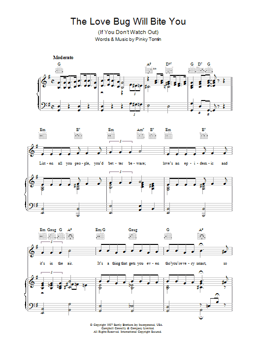Download or print Pinky Tomlin The Love Bug Will Bite You (If You Don't Watch Out ) sheet music, chords and digital score arranged for Piano, Vocal & Guitar Chords. This Pop score includes 5 page(s).