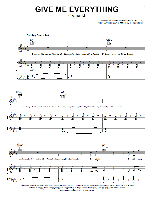 Download or print Pitbull featuring Ne-Yo Give Me Everything (Tonight) sheet music, chords and digital score arranged for Piano, Vocal & Guitar Chords (Right-Hand Melody). This R & B score includes 9 page(s).