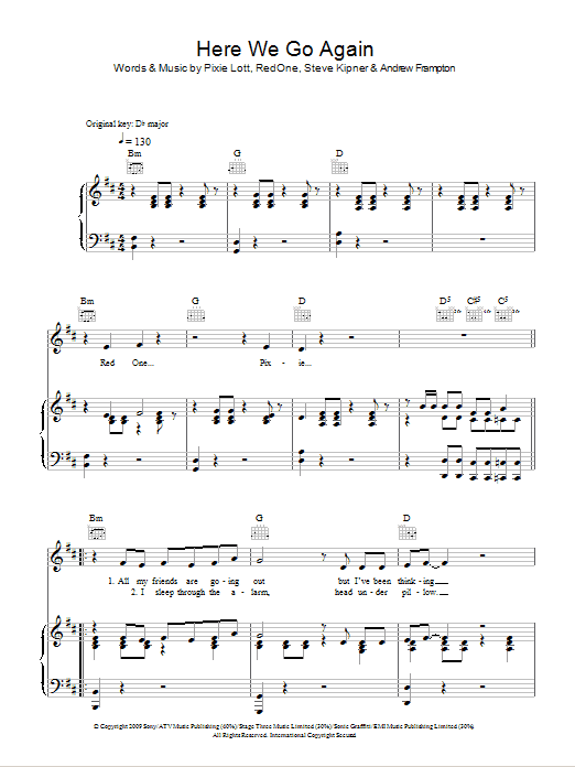 Download or print Pixie Lott Here We Go Again sheet music, chords and digital score arranged for Piano, Vocal & Guitar Chords. This Pop score includes 8 page(s).