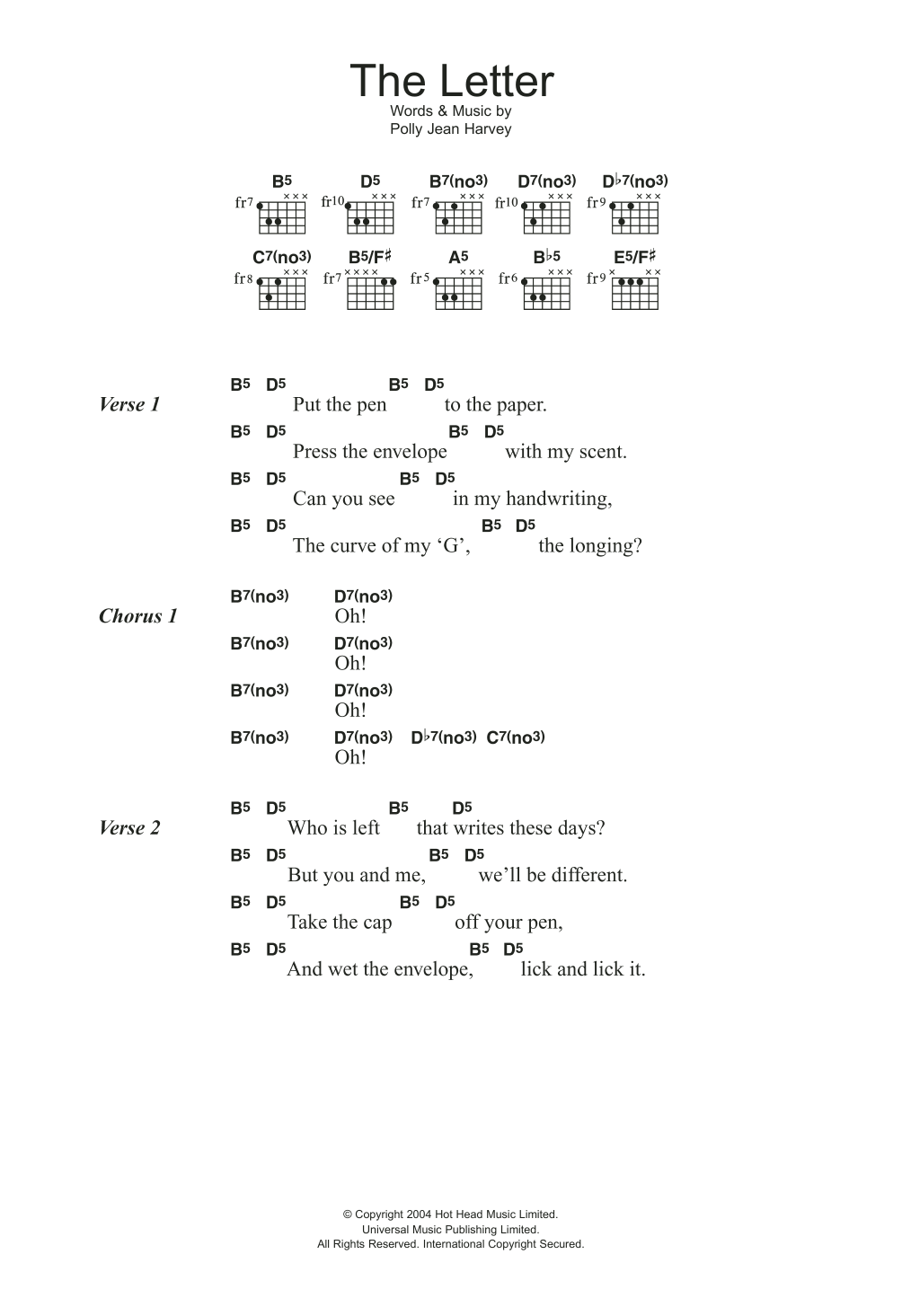 Download or print PJ Harvey The Letter sheet music, chords and digital score arranged for Guitar Chords/Lyrics. This Rock score includes 2 page(s).