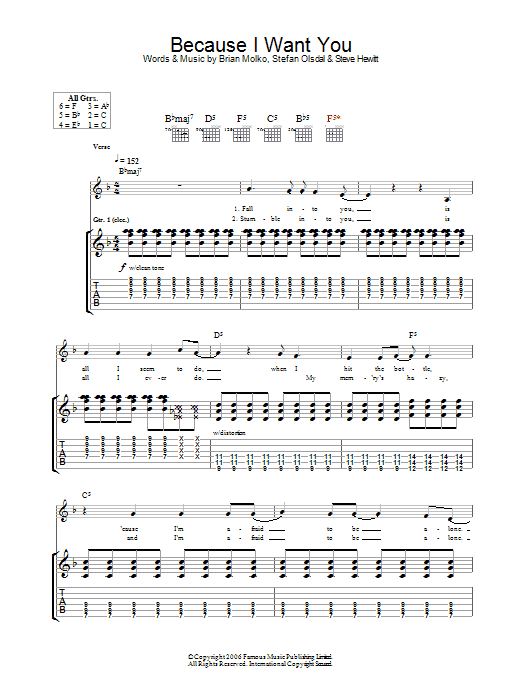 Download or print Placebo Because I Want You sheet music, chords and digital score arranged for Guitar Chords/Lyrics. This Rock score includes 3 page(s).