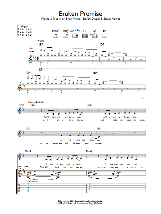 Download or print Placebo Broken Promise sheet music, chords and digital score arranged for Guitar Tab. This Rock score includes 5 page(s).