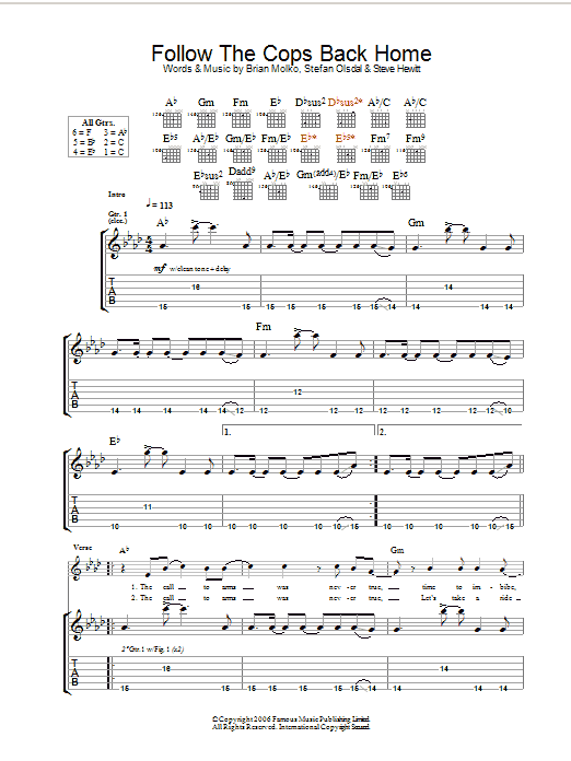 Download or print Placebo Follow The Cops Back Home sheet music, chords and digital score arranged for Guitar Tab. This Rock score includes 9 page(s).