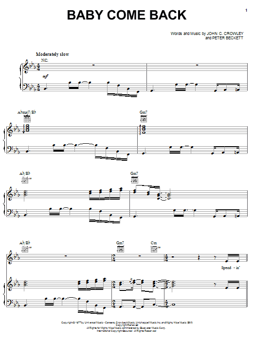 Download or print Player Baby Come Back sheet music, chords and digital score arranged for Piano, Vocal & Guitar Chords (Right-Hand Melody). This Love score includes 6 page(s).