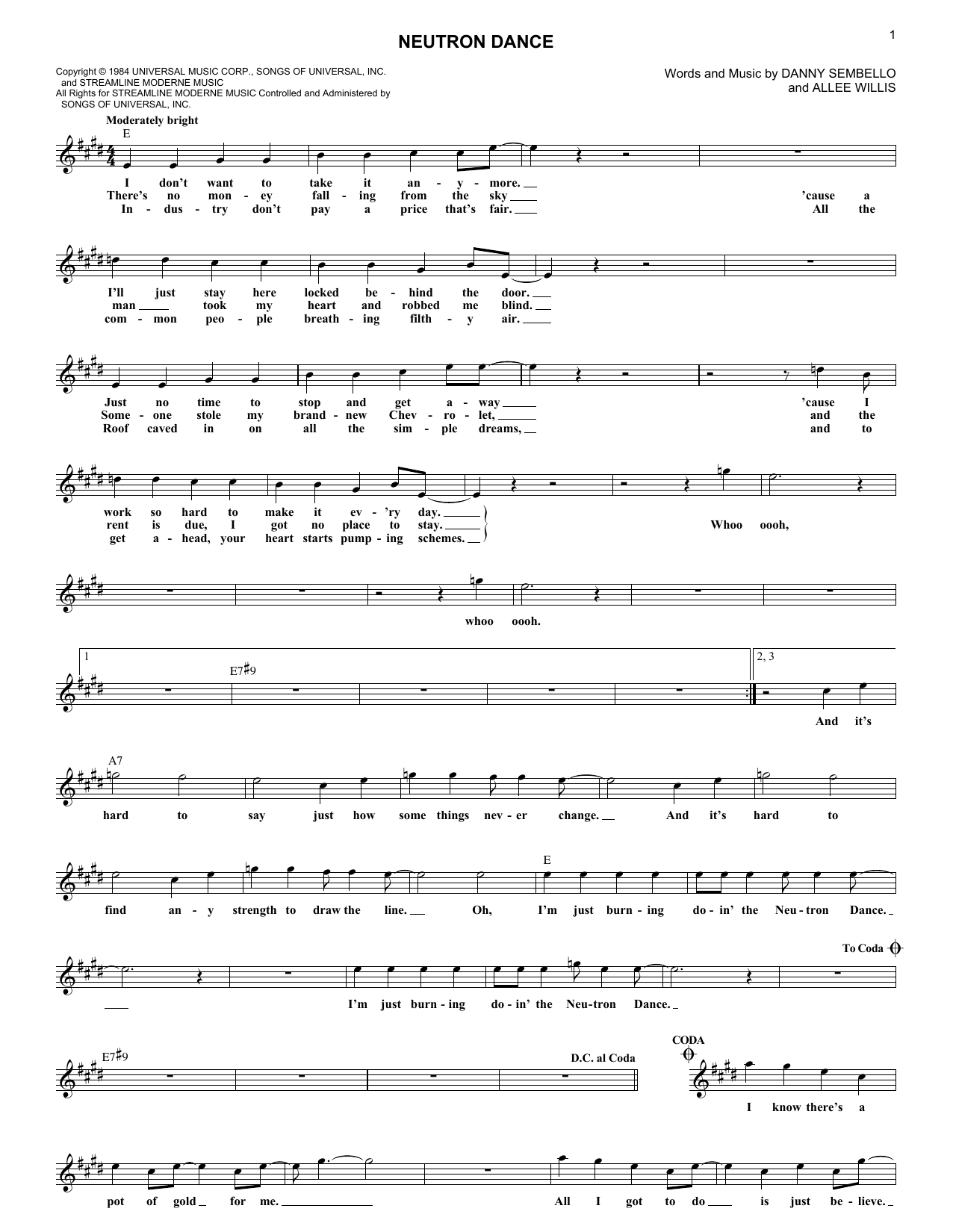 Download or print Pointer Sisters Neutron Dance sheet music, chords and digital score arranged for Lead Sheet / Fake Book. This Pop score includes 2 page(s).