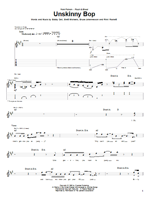 Download or print Poison Unskinny Bop sheet music, chords and digital score arranged for Guitar Tab. This Metal score includes 8 page(s).