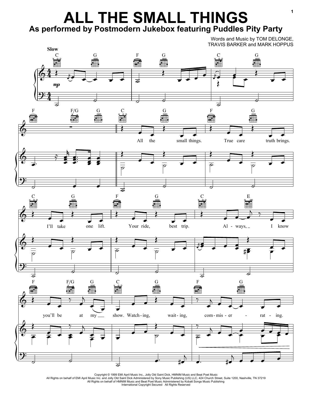 Download or print Postmodern Jukebox ft. Puddles Pity Party All The Small Things (John Lewis 2022) sheet music, chords and digital score arranged for Piano, Vocal & Guitar Chords (Right-Hand Melody). This Rock score includes 5 page(s).