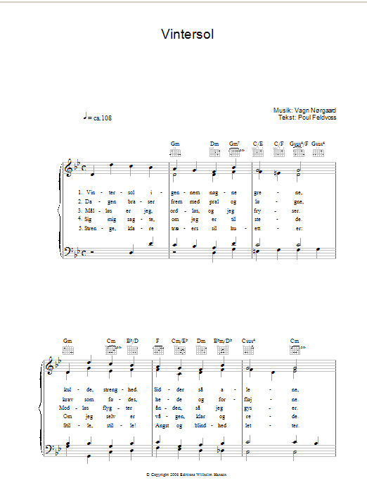 Download or print Poul Feldvoss Vintersol sheet music, chords and digital score arranged for Piano, Vocal & Guitar Chords. This Pop score includes 2 page(s).