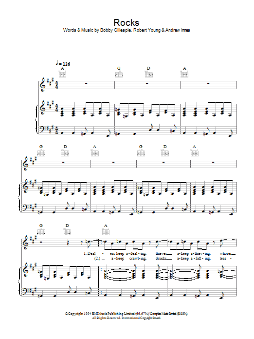 Download or print Primal Scream Rocks sheet music, chords and digital score arranged for Guitar Chords/Lyrics. This Rock score includes 3 page(s).