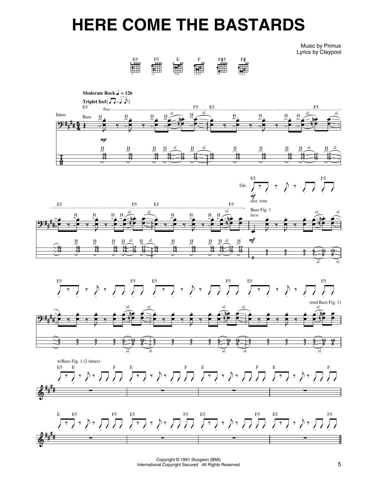 Download or print Primus Here Come The Bastards sheet music, chords and digital score arranged for Guitar Tab. This Rock score includes 4 page(s).