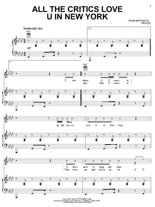 Download or print Prince All The Critics Love U In New York sheet music, chords and digital score arranged for Piano, Vocal & Guitar Chords (Right-Hand Melody). This Funk score includes 5 page(s).