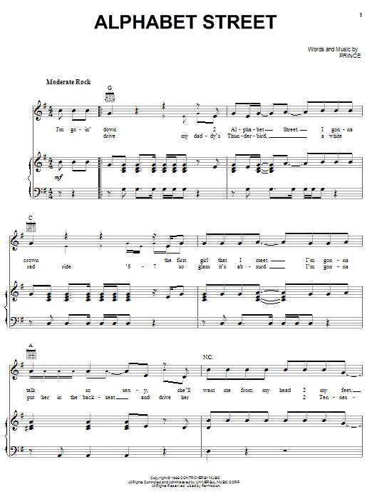 Download or print Prince Alphabet Street sheet music, chords and digital score arranged for Piano, Vocal & Guitar Chords (Right-Hand Melody). This Funk score includes 7 page(s).