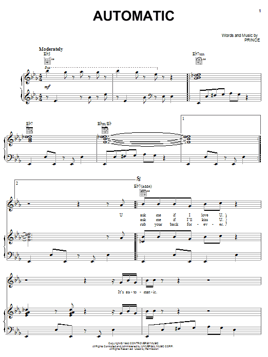 Download or print Prince Automatic sheet music, chords and digital score arranged for Piano, Vocal & Guitar Chords (Right-Hand Melody). This Funk score includes 8 page(s).