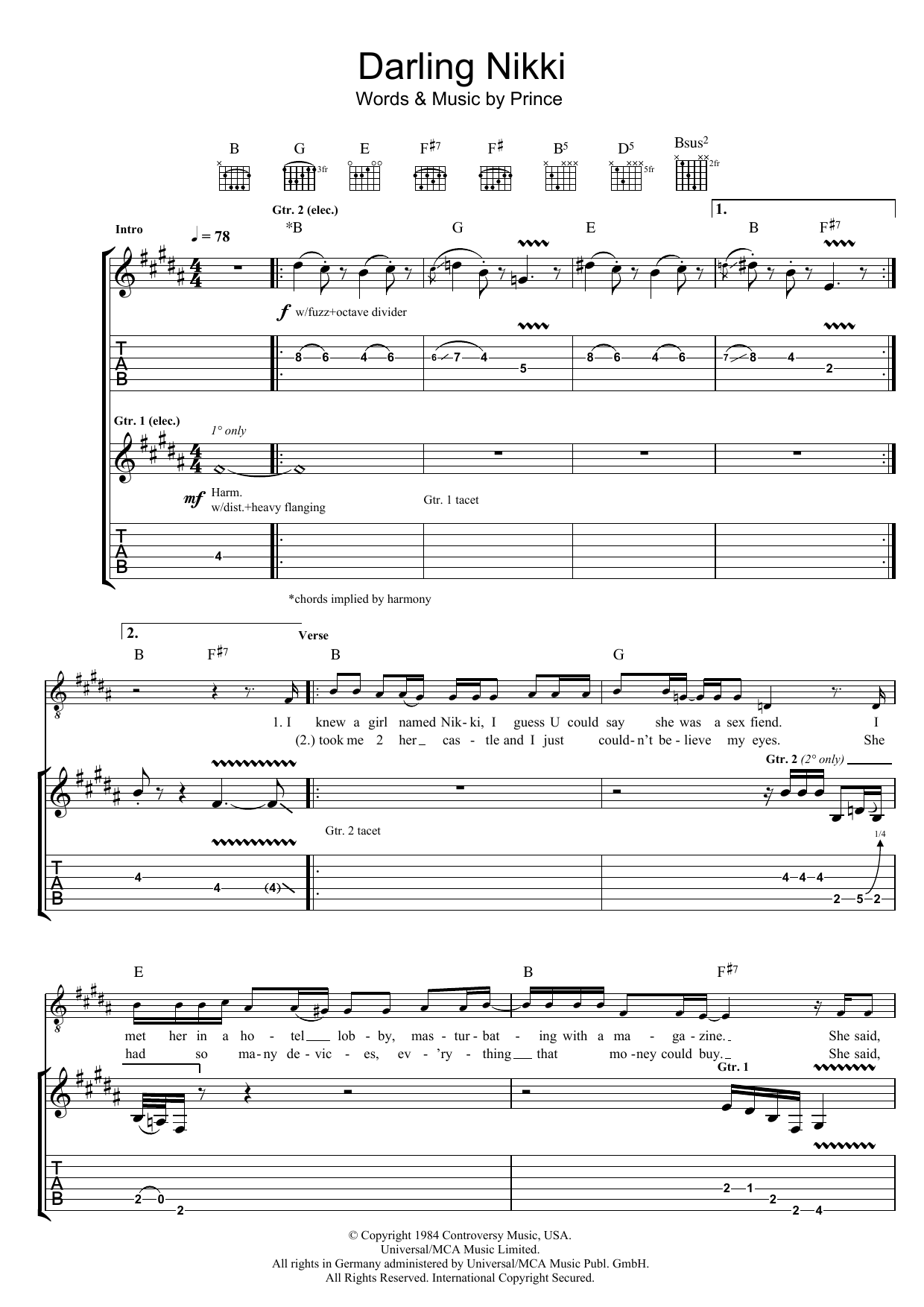 Download or print Prince Darling Nikki sheet music, chords and digital score arranged for Guitar Tab. This Pop score includes 6 page(s).