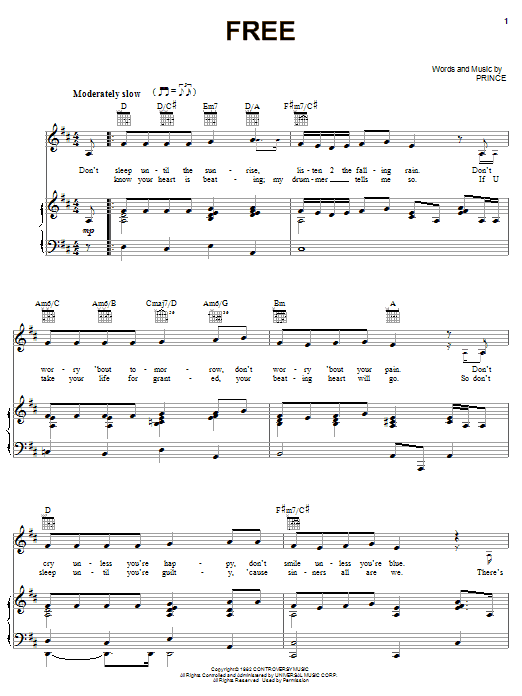 Download or print Prince Free sheet music, chords and digital score arranged for Piano, Vocal & Guitar Chords (Right-Hand Melody). This Funk score includes 6 page(s).