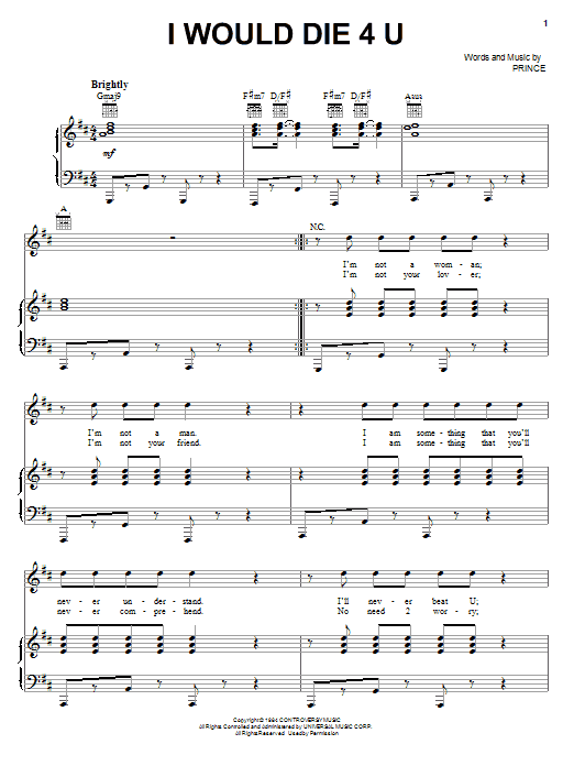 Download or print Prince I Would Die 4 U sheet music, chords and digital score arranged for Easy Piano. This Film/TV score includes 3 page(s).