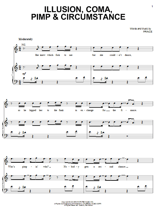 Download or print Prince Illusion, Coma, Pimp & Circumstance sheet music, chords and digital score arranged for Piano, Vocal & Guitar Chords (Right-Hand Melody). This Pop score includes 12 page(s).