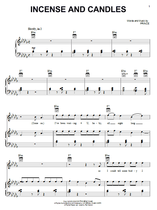Download or print Prince Incense And Candles sheet music, chords and digital score arranged for Piano, Vocal & Guitar Chords (Right-Hand Melody). This Funk score includes 10 page(s).
