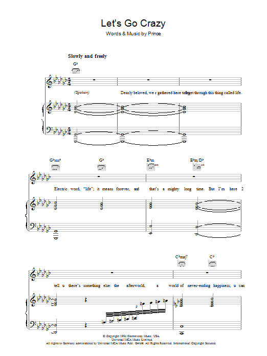 Download or print Prince Let's Go Crazy sheet music, chords and digital score arranged for Piano, Vocal & Guitar Chords (Right-Hand Melody). This Film/TV score includes 7 page(s).