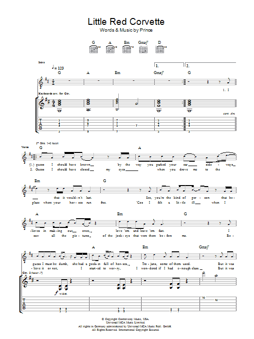 Download or print Prince Little Red Corvette sheet music, chords and digital score arranged for Easy Piano. This Funk score includes 5 page(s).
