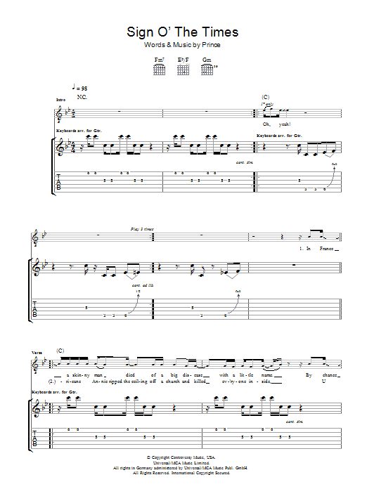 Download or print Prince Sign O' The Times sheet music, chords and digital score arranged for Easy Piano. This Pop score includes 7 page(s).