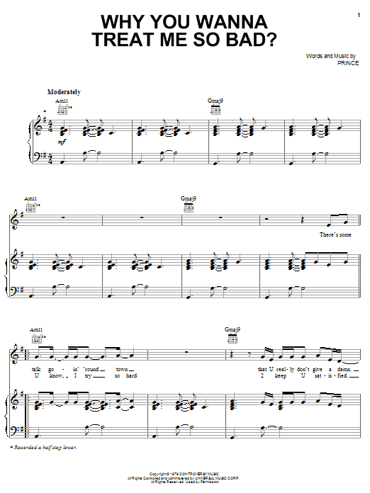 Download or print Prince Why You Wanna Treat Me So Bad sheet music, chords and digital score arranged for Piano, Vocal & Guitar Chords (Right-Hand Melody). This Funk score includes 5 page(s).