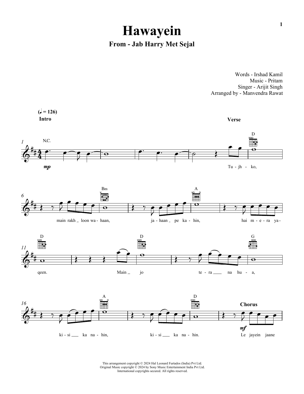 Download or print Pritam and Arijit Singh Hawayein (from Jab Harry Met Sejal) sheet music, chords and digital score arranged for Lead Sheet / Fake Book. This Hindi score includes 4 page(s).