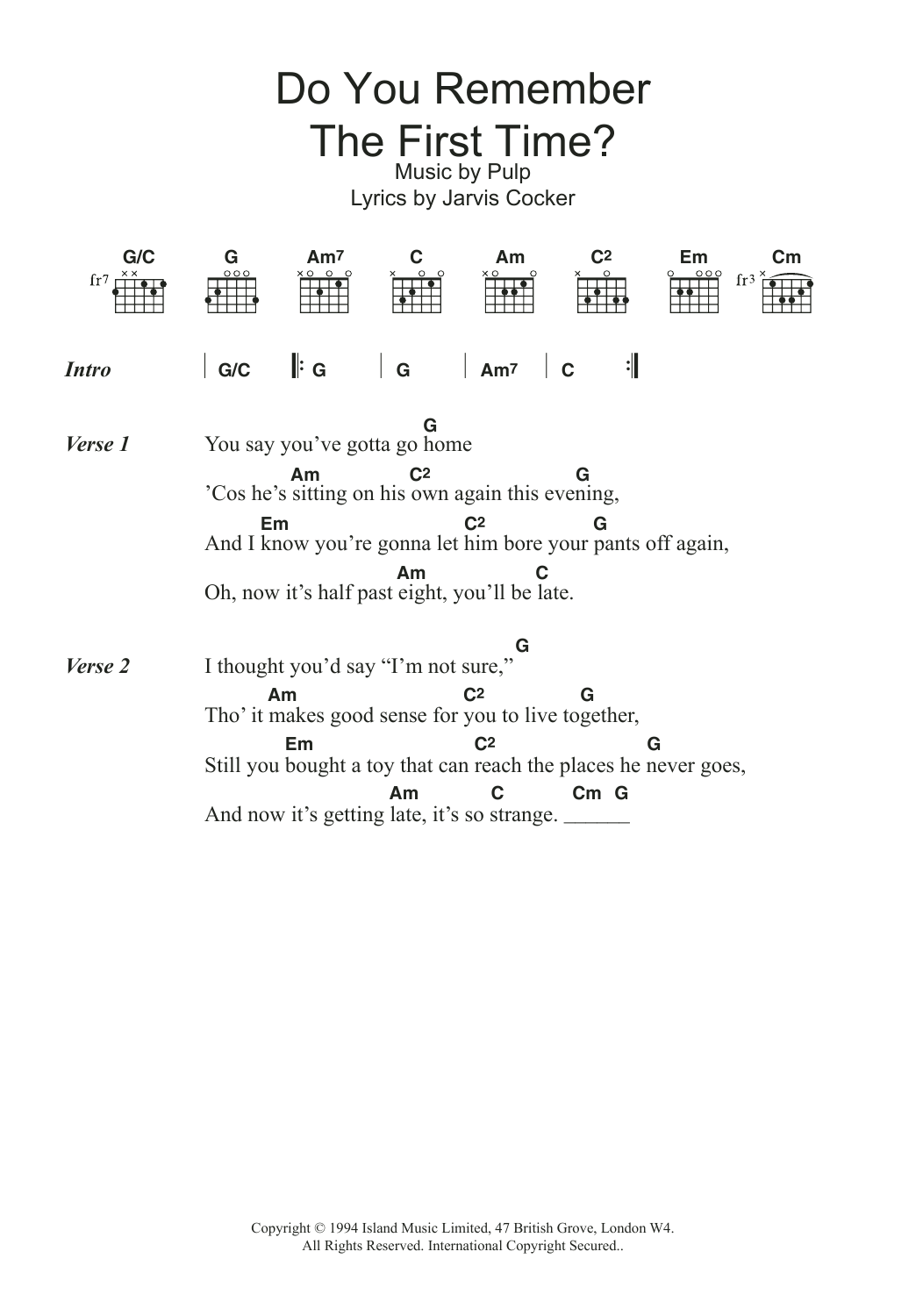 Download or print Pulp Do You Remember The First Time? sheet music, chords and digital score arranged for Guitar Chords/Lyrics. This Rock score includes 3 page(s).