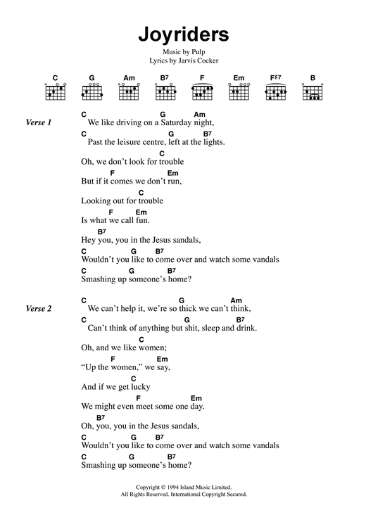 Download or print Pulp Joyriders sheet music, chords and digital score arranged for Guitar Chords/Lyrics. This Pop score includes 2 page(s).