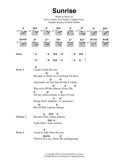 Download or print Pulp Sunrise sheet music, chords and digital score arranged for Guitar Chords/Lyrics. This Pop score includes 3 page(s).