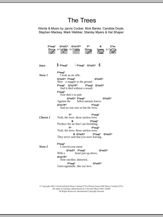 Download or print Pulp The Trees sheet music, chords and digital score arranged for Guitar Chords/Lyrics. This Rock score includes 2 page(s).