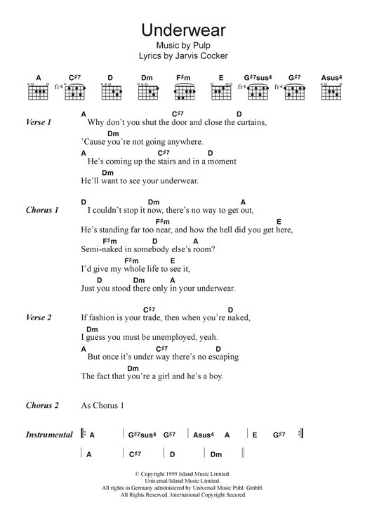 Download or print Pulp Underwear sheet music, chords and digital score arranged for Guitar Chords/Lyrics. This Pop score includes 2 page(s).