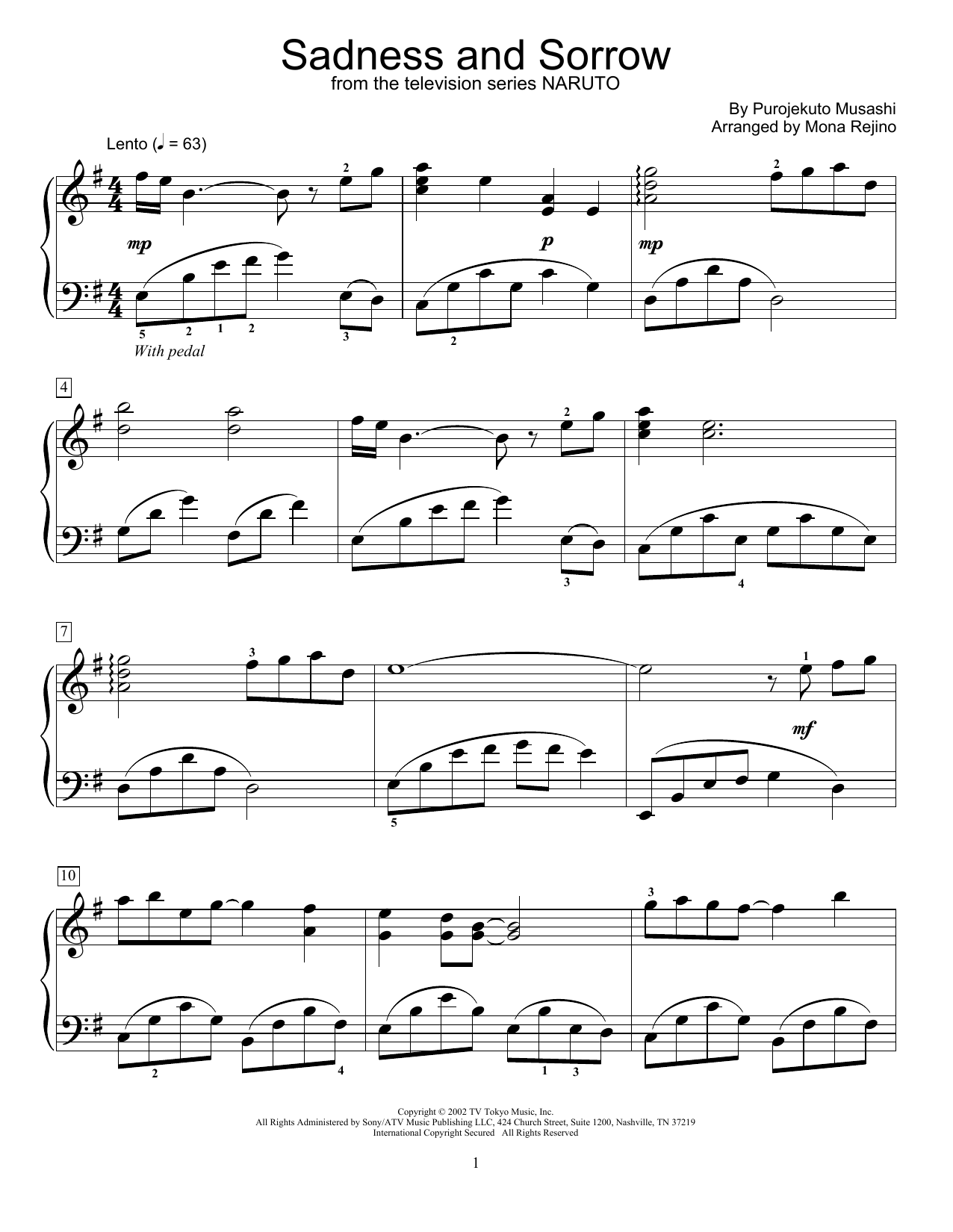 Download or print Purojekuto Musashi Sadness And Sorrow (from Naruto) (arr. Mona Rejino) sheet music, chords and digital score arranged for Educational Piano. This Film/TV score includes 2 page(s).