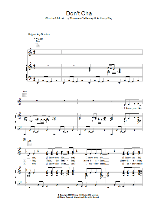 Download or print Pussycat Dolls Don't Cha sheet music, chords and digital score arranged for Piano, Vocal & Guitar Chords (Right-Hand Melody). This Pop score includes 5 page(s).