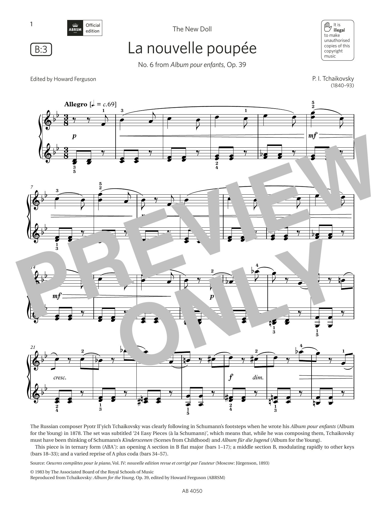 Download or print Pyotr Il'yich Tchaikovsky La nouvelle poupée (Grade 4, list B3, from the ABRSM Piano Syllabus 2023 & 2024) sheet music, chords and digital score arranged for Piano Solo. This Classical score includes 2 page(s).