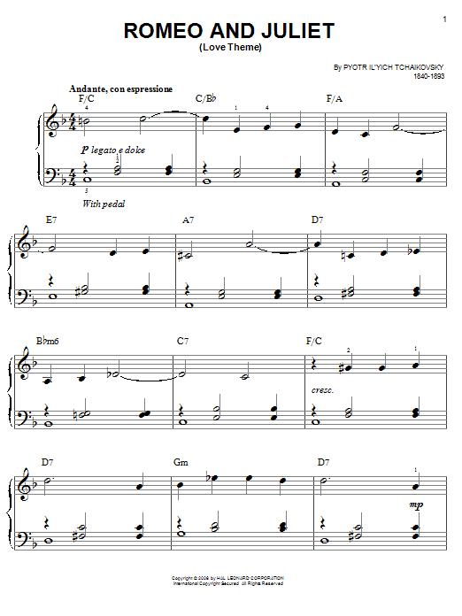 Download or print Pyotr Ilyich Tchaikovsky Romeo And Juliet (Love Theme) sheet music, chords and digital score arranged for Easy Piano. This Classical score includes 3 page(s).