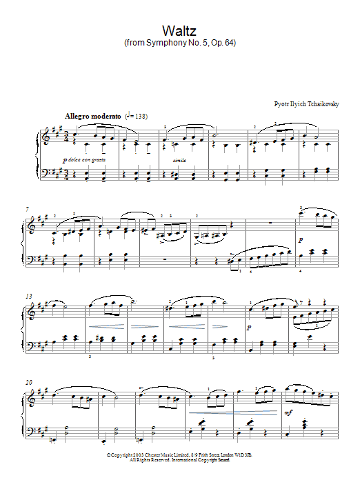 Download or print Pyotr Il'yich Tchaikovsky Waltz (from Symphony No. 5, Op. 64) sheet music, chords and digital score arranged for Piano Solo. This Classical score includes 4 page(s).