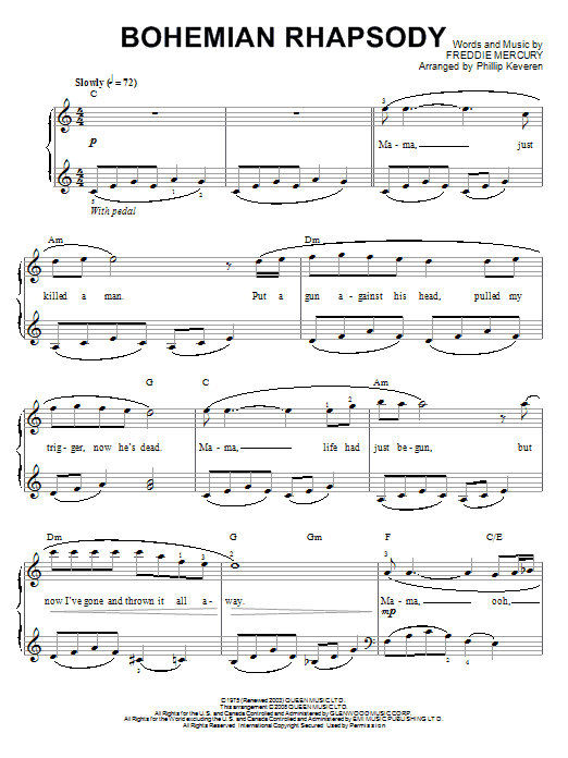 Download or print Queen Bohemian Rhapsody (arr. Phillip Keveren) sheet music, chords and digital score arranged for Piano Duet. This Rock score includes 10 page(s).