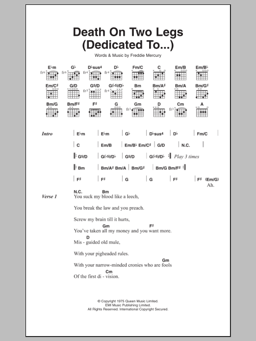 Download or print Queen Death On Two Legs (Dedicated To...) sheet music, chords and digital score arranged for Guitar Chords/Lyrics. This Rock score includes 3 page(s).
