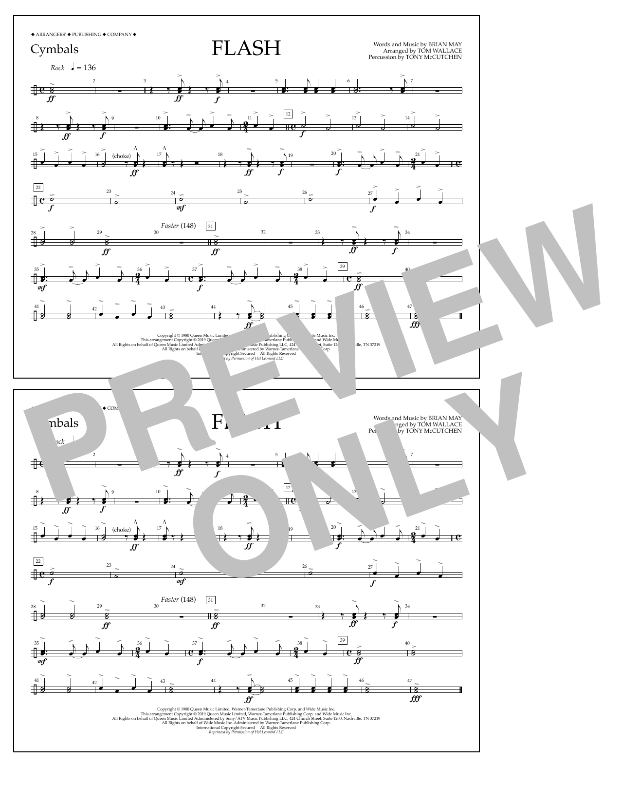 Download or print Queen Flash (arr. Tom Wallace) - Cymbals sheet music, chords and digital score arranged for Marching Band. This Rock score includes 1 page(s).