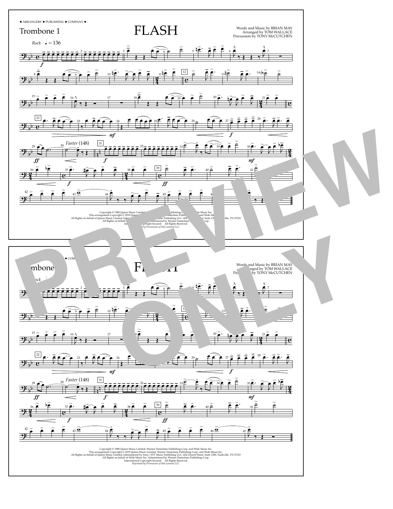 Download or print Queen Flash (arr. Tom Wallace) - Trombone 1 sheet music, chords and digital score arranged for Marching Band. This Rock score includes 1 page(s).