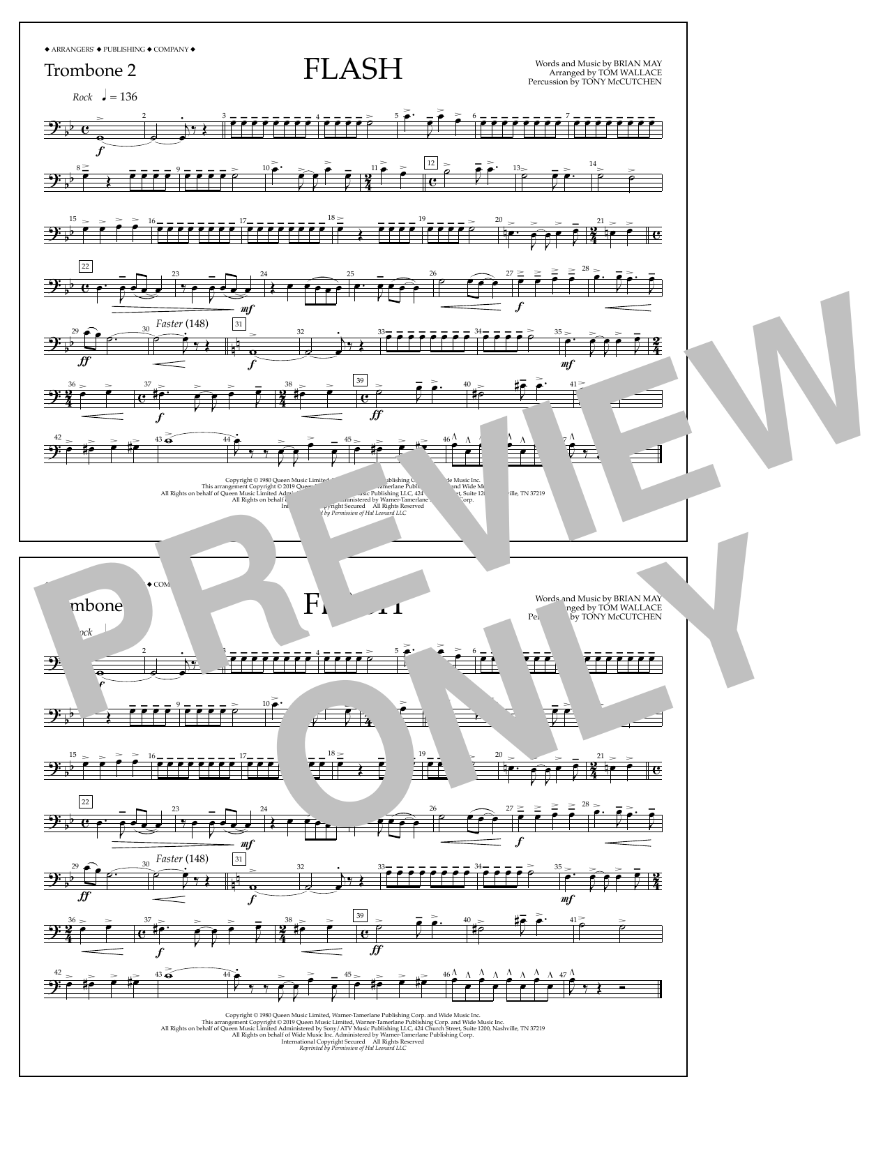 Download or print Queen Flash (arr. Tom Wallace) - Trombone 2 sheet music, chords and digital score arranged for Marching Band. This Rock score includes 1 page(s).