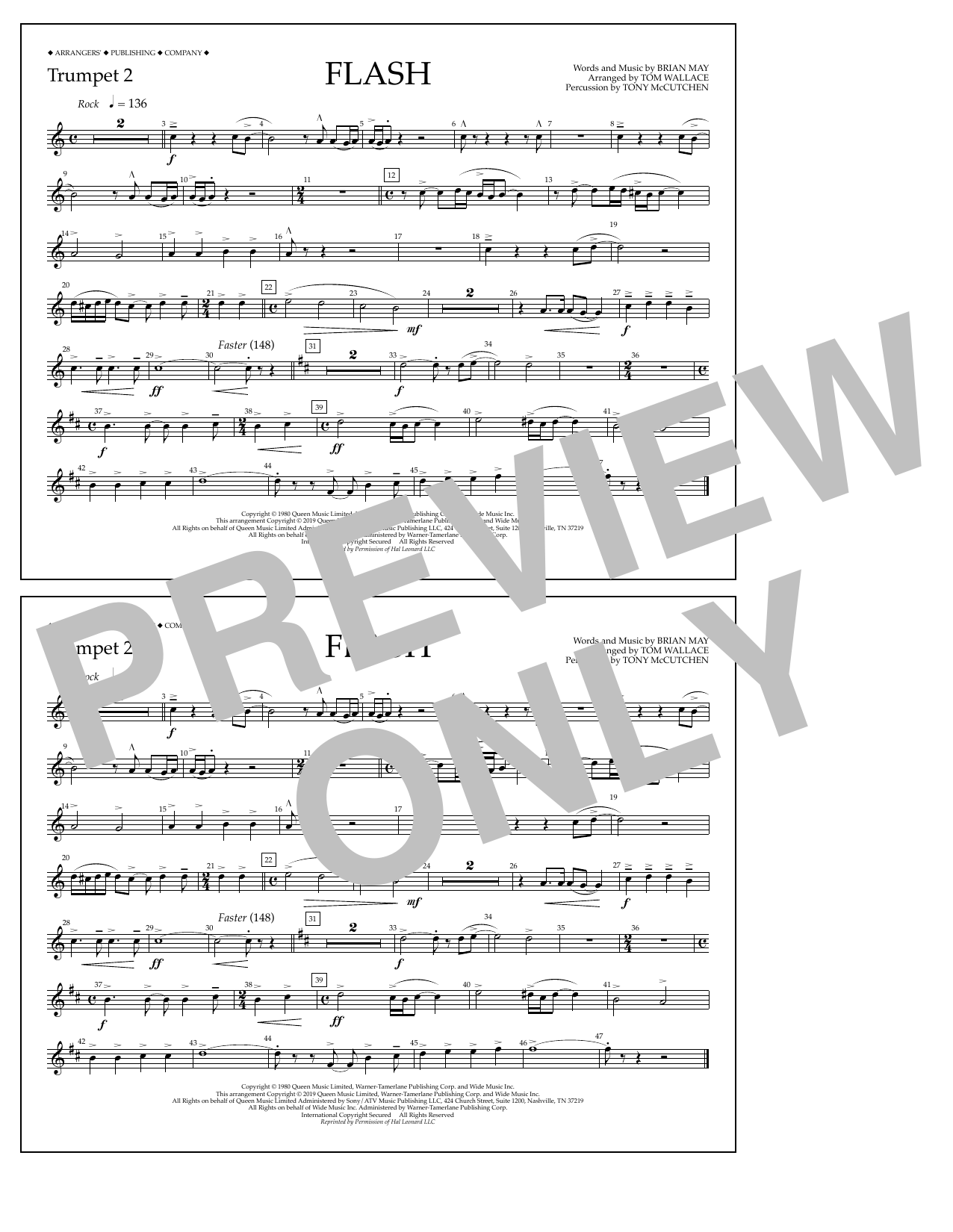 Download or print Queen Flash (arr. Tom Wallace) - Trumpet 2 sheet music, chords and digital score arranged for Marching Band. This Rock score includes 1 page(s).