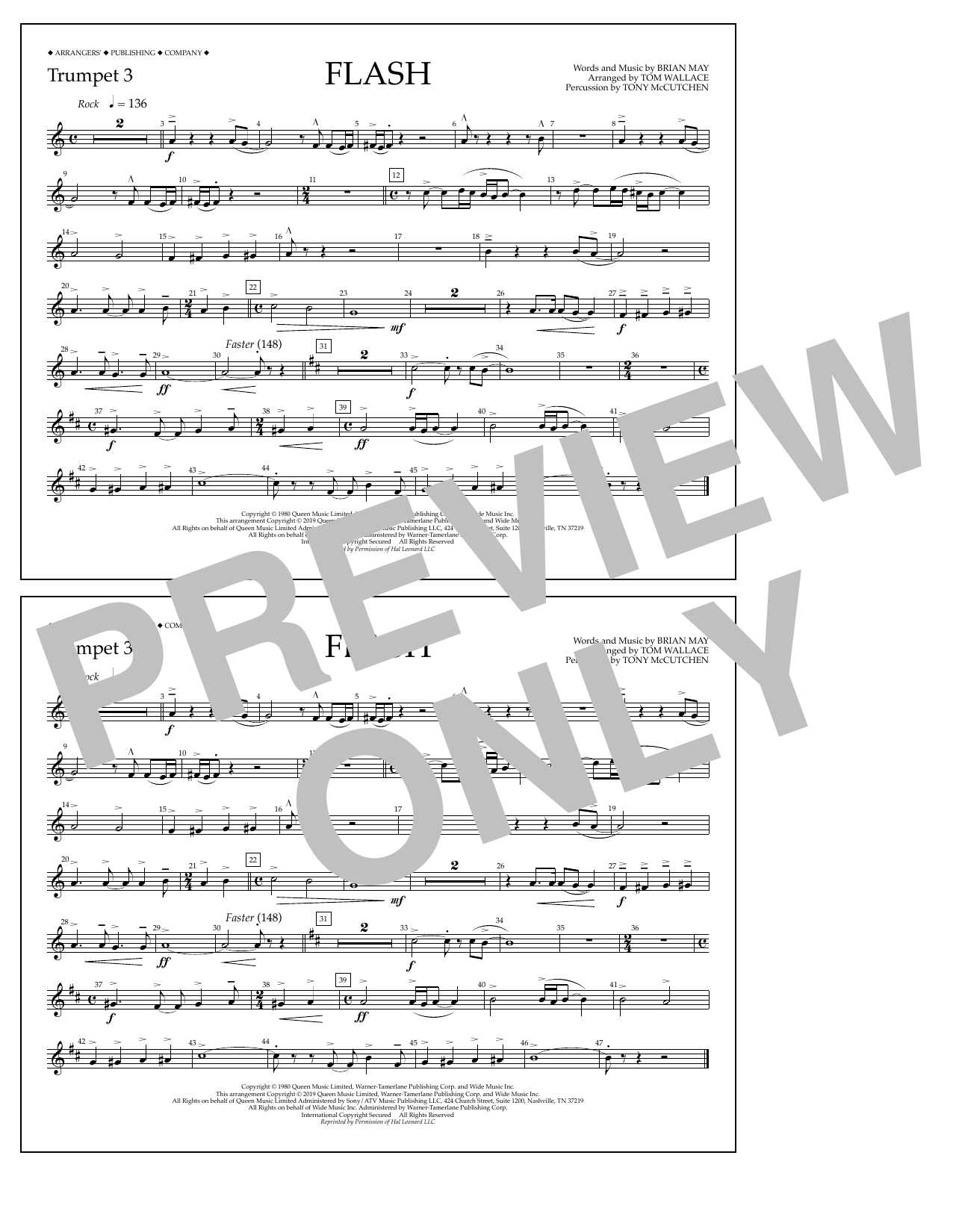 Download or print Queen Flash (arr. Tom Wallace) - Trumpet 3 sheet music, chords and digital score arranged for Marching Band. This Rock score includes 1 page(s).