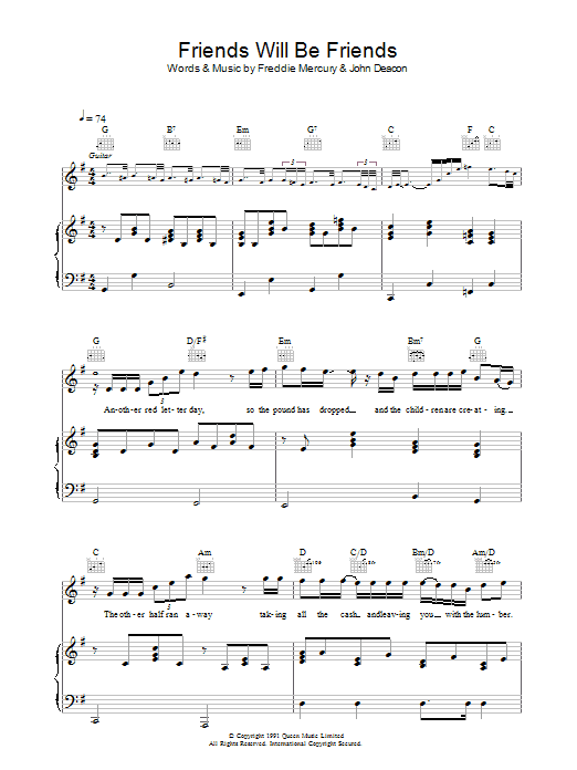 Download or print Queen Friends Will Be Friends sheet music, chords and digital score arranged for Guitar Chords/Lyrics. This Rock score includes 3 page(s).